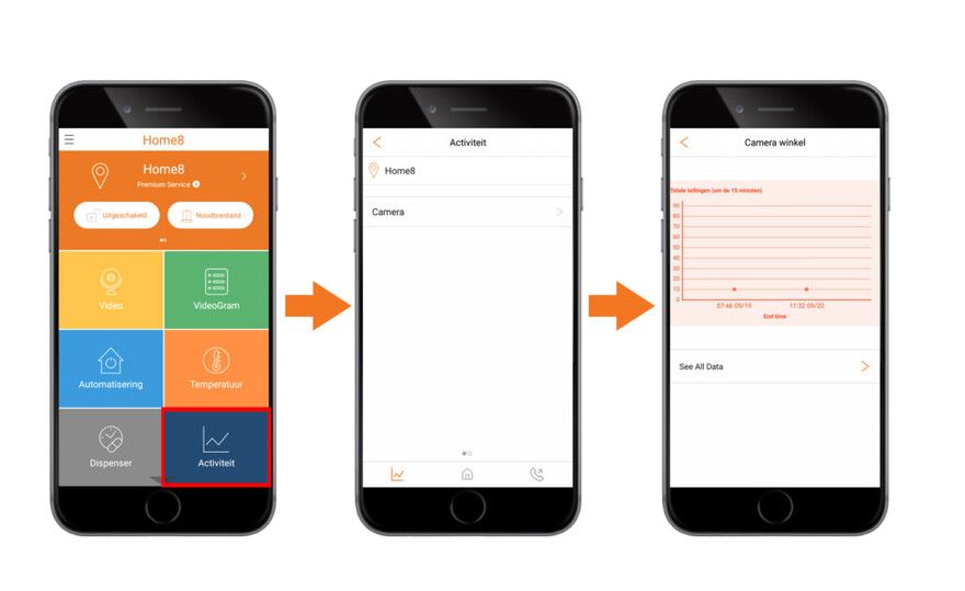 Om de vastgelegde activiteiten te zien, tik je op ‘Activiteit’ in het startscherm van de app en selecteer je vervolgens het apparaat voor de activiteit die je wilt bijhouden. Je krijgt dan een grafiek te zien met ‘Eindtijd’ op de X-as en ‘Totale tellingen om de 15 minuten’ op de Y-as. Totale tellingen vertegenwoordigen het aantal bewegingsdetecties binnen een geactiveerde periode. De grafiek toont bovendien activiteit over de laatste 3 dagen.