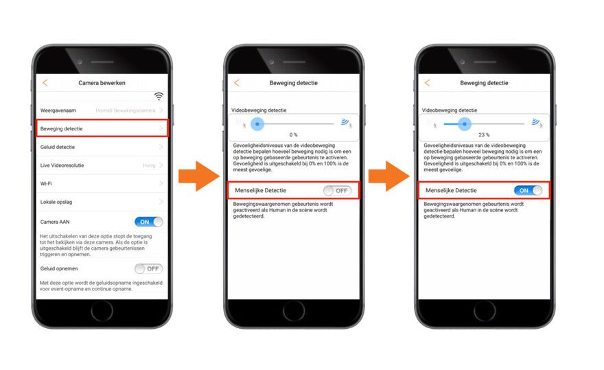 Deze functie staat standaard uitgeschakeld. Om deze aan te zetten, ga je naar het zijbalk menu, tik je op ‘Apparaatbeheer’, selecteer je een camera om te bewerken, tik je vervolgens op ‘Bewegingsdetectie’ en schakel je ‘Menselijke Detectie’ in. Houd er rekening mee dat ‘Bewegingsgevoeligheid’ moet worden ingesteld op meer dan 0% om ‘Menselijke Detectie’ in te schakelen.